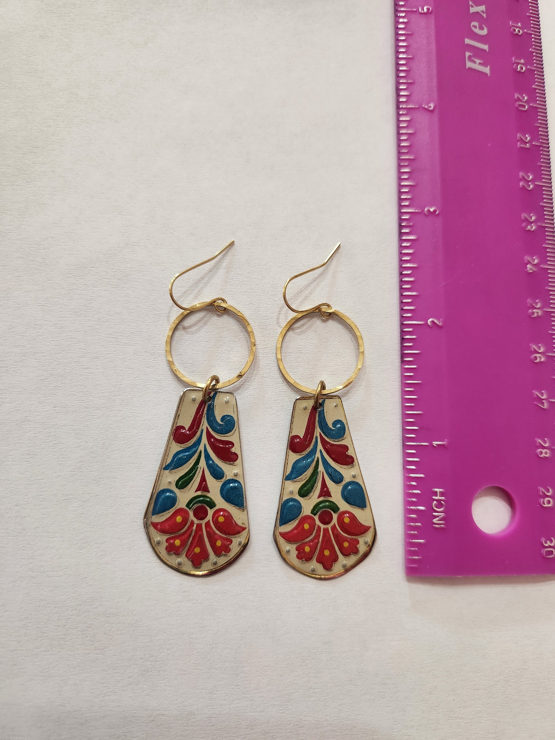Beautiful embossed floral tin with hammered brass hoops. Super lightweight. 2 1/2 inches long on small brass earwires.