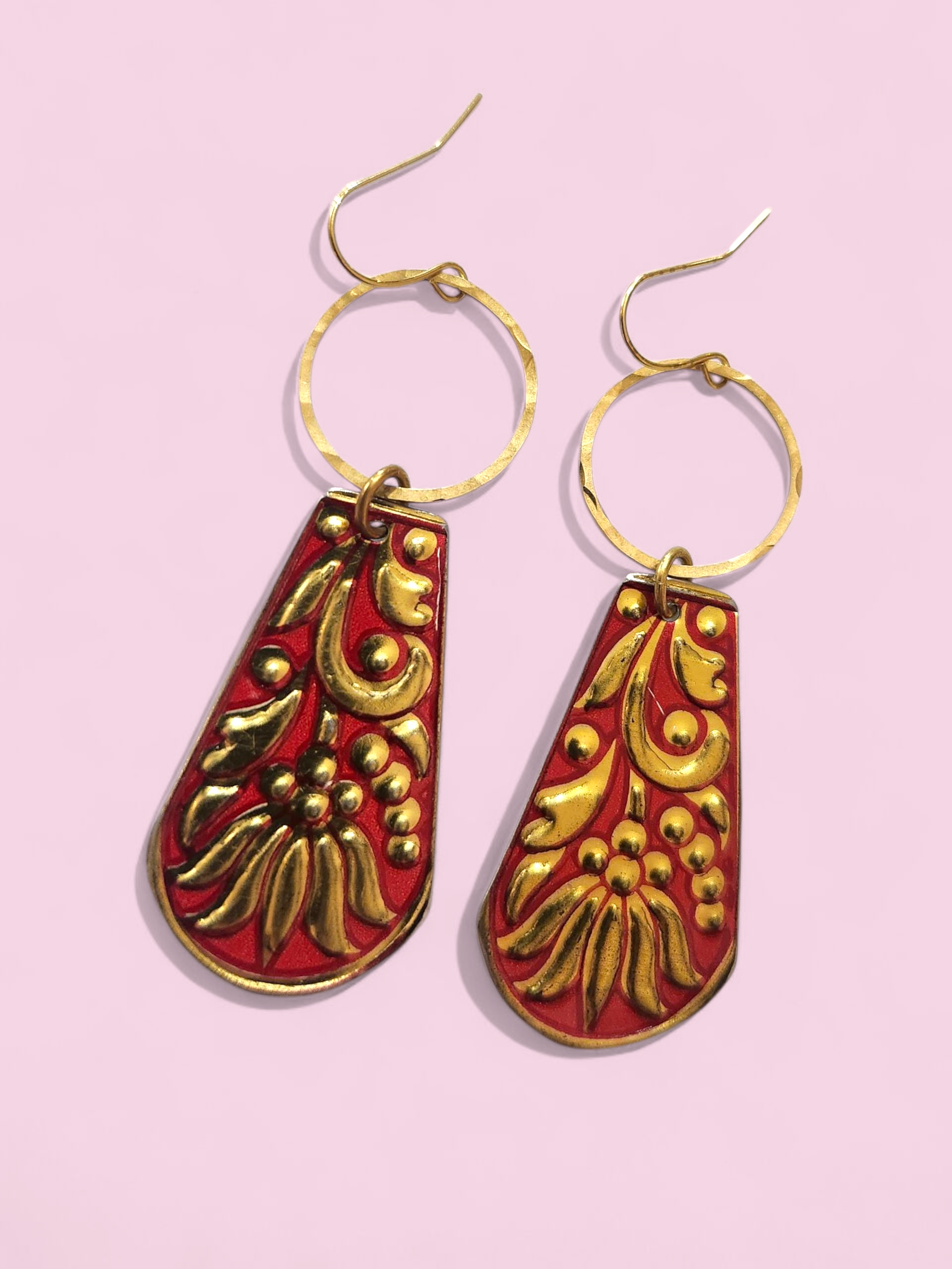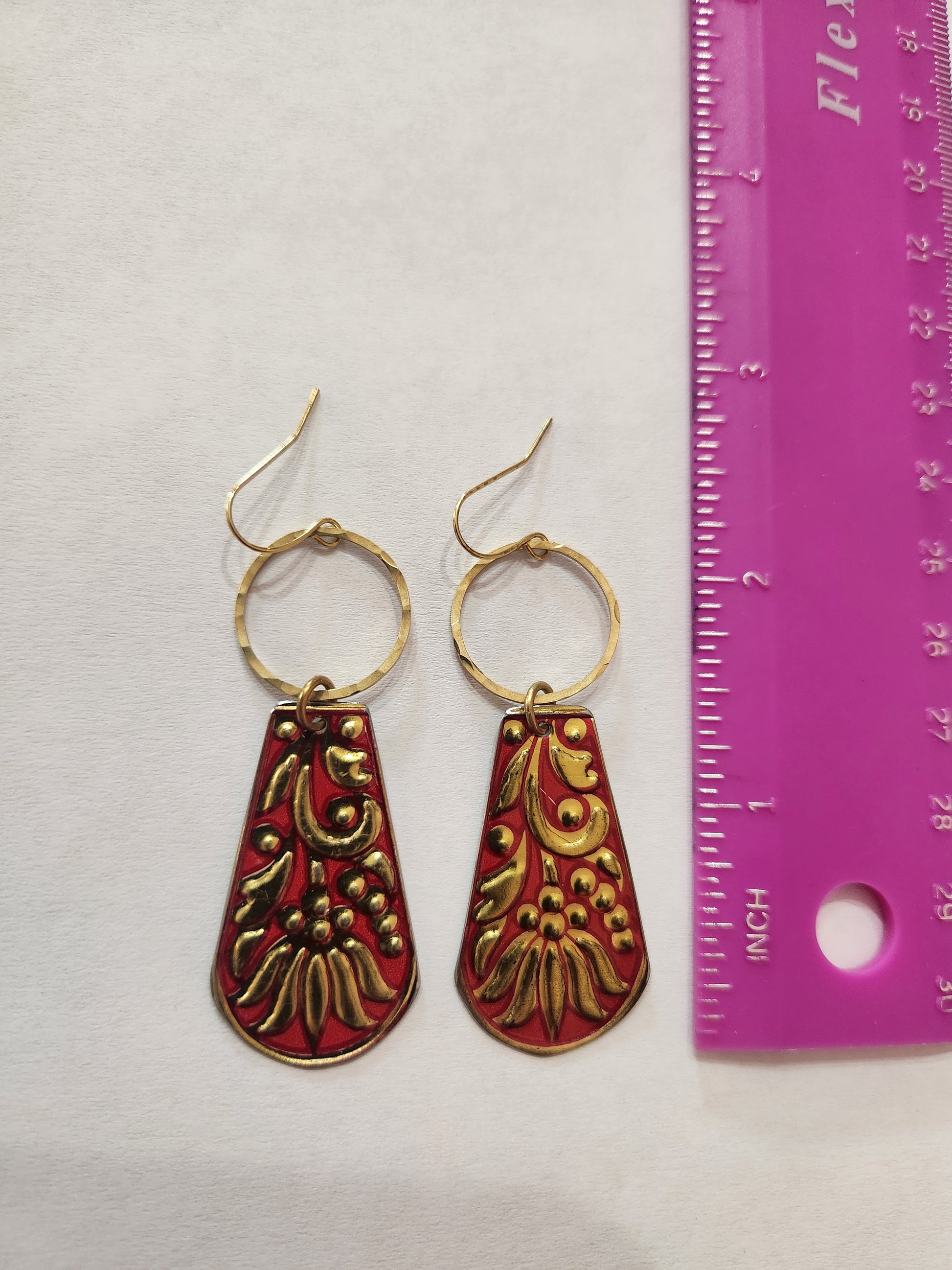 Beautiful red and gold embossed tin with hammered brass hoops. Super lightweight. 2 1/2 inches long on small brass earwires.