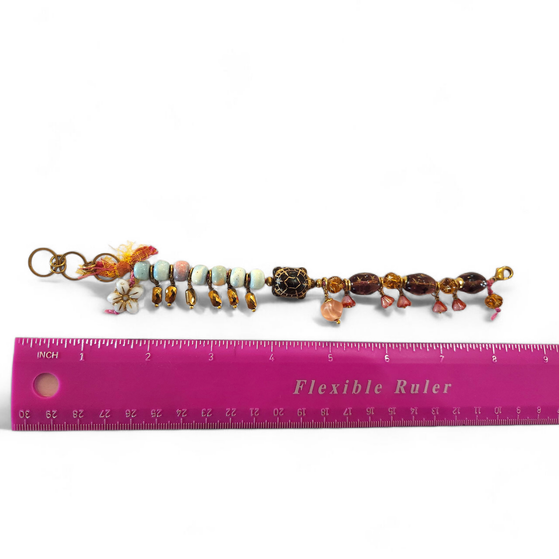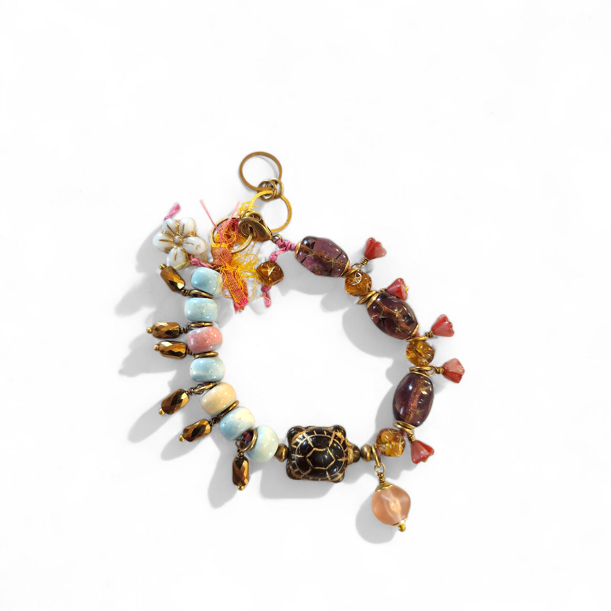 This hand knotted charm bracelet contains beautiful watercolor agate stones and all sorts of Czech glass and crystal beads, with this amber colored turtle focal bead. Lovely topaz and purple tones, with a little light blue and a rich mustard sari silk scrappy bit. With a brass lobster claw clasp and findings, the bracelet is adjustable between 7 and 8 1/2 inches. More length can be added, just send me a note in checkout if you need it longer.