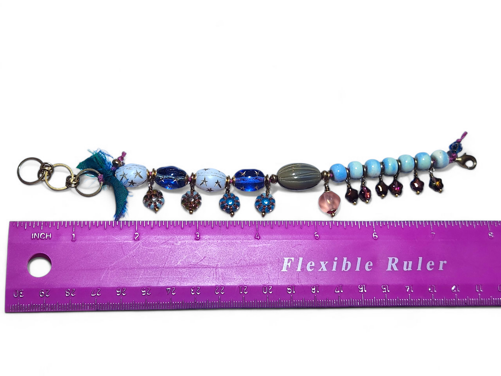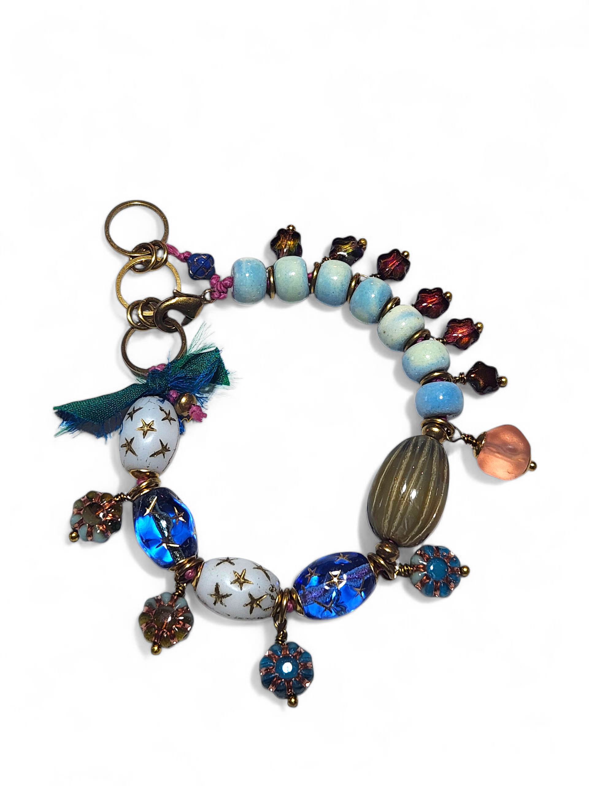 This beauty is hand knotted on pink Linhasita waxed cord and loaded with Czech glass and watercolor agate stones. It's adjustable between 7 and 8 inches, more length can be added if needed, just leave me a note at checkout. With brass lobster claw closure and findings and little bits of rich teal sari silk added on.