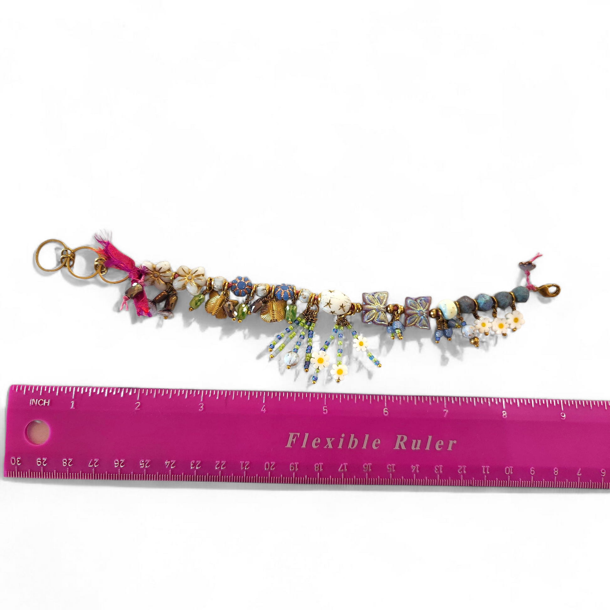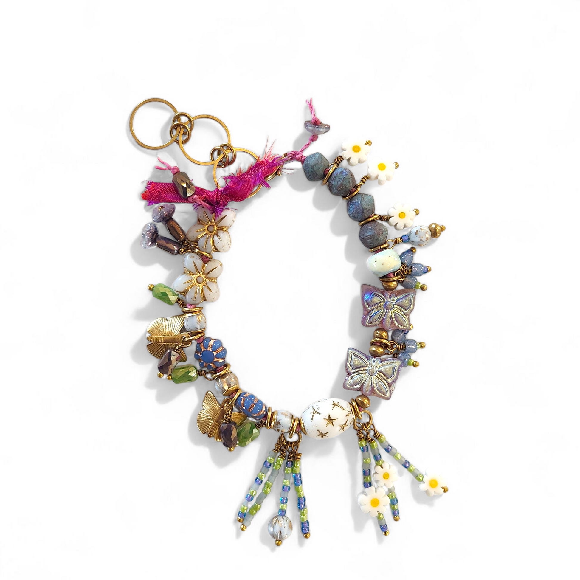 This beauty is hand knotted on pink Linhasita waxed cord and absolutely loaded with Czech glass, crystals, brass, and milliefiori glass. Butterflies and flowers galore. Adjustable between 7 1/2 and 9 inches.